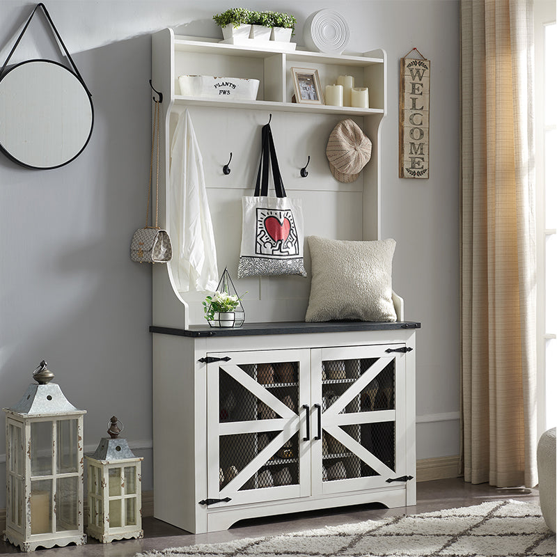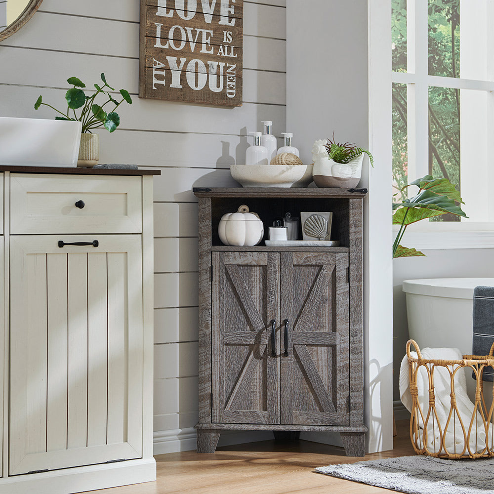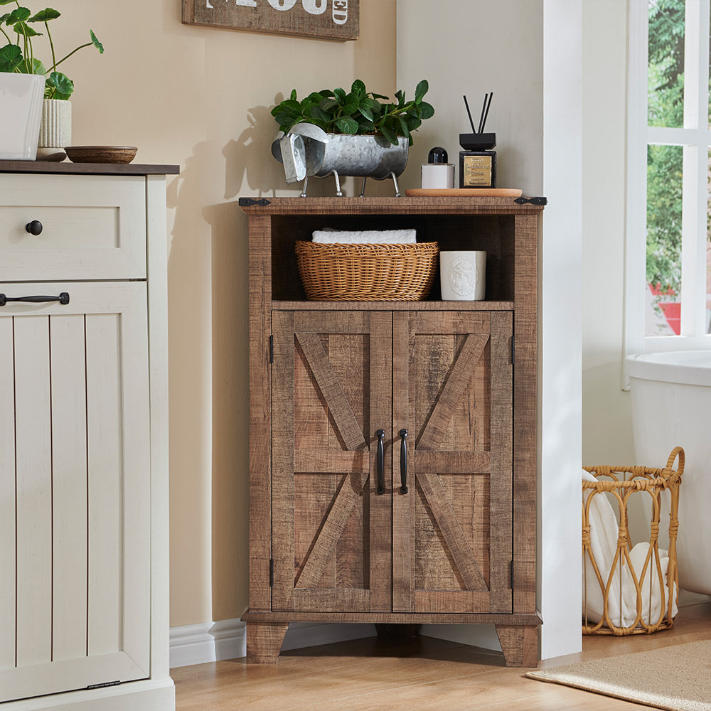 - [Size & Capacity]: The external size of the corner cabinet is 22"W * 14"D * 32"H, including a farmhouse classic upper open storage place and cabinet with double barn doors for internal storage, placed in the corner for use, suitable for storing aromatherapy, toiletries, paper towels and other bathroom supplies, better planning your bathroom space, enjoy a comfortable home life.