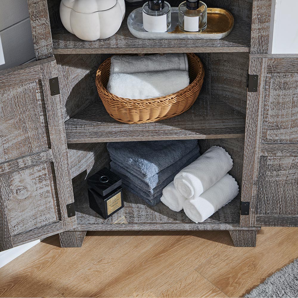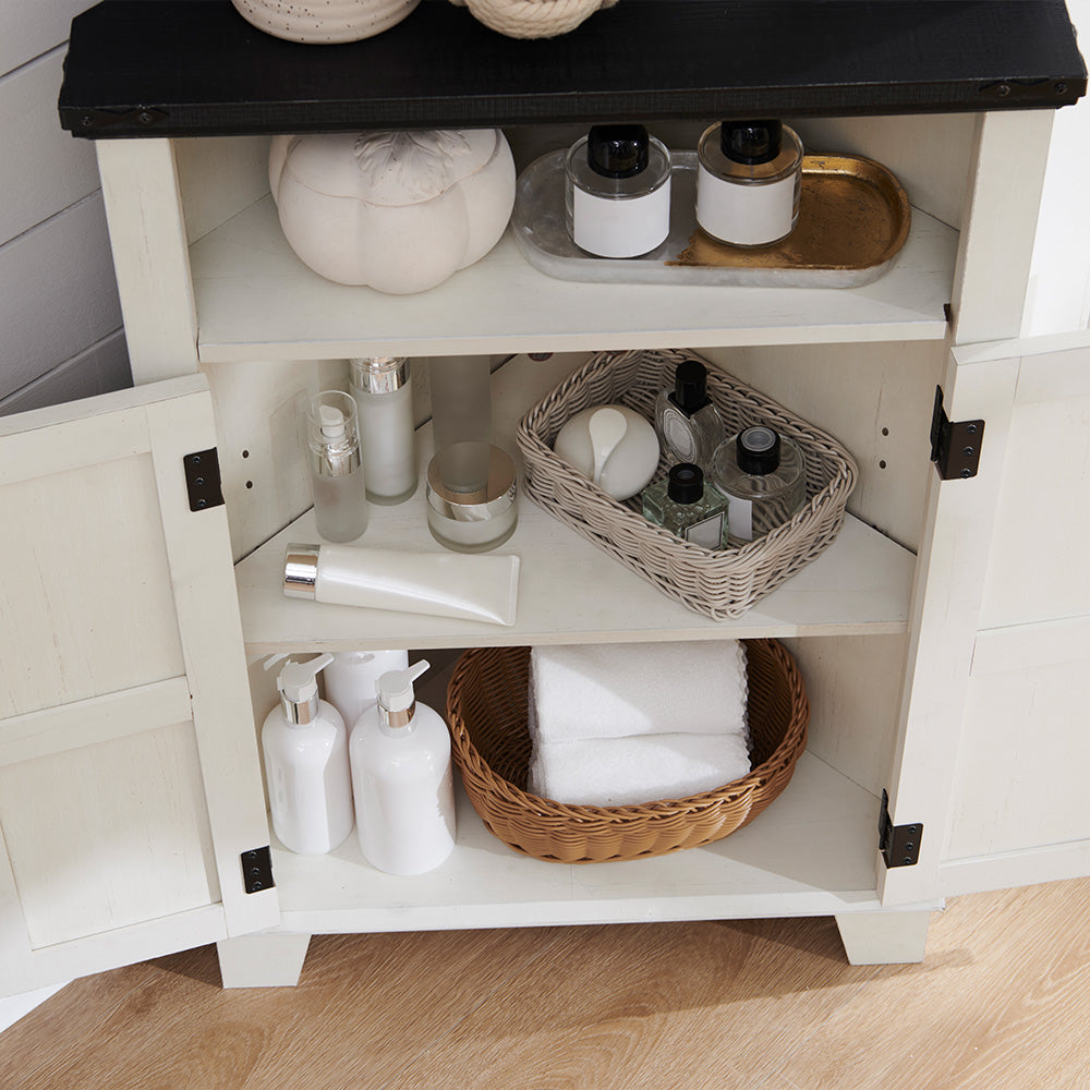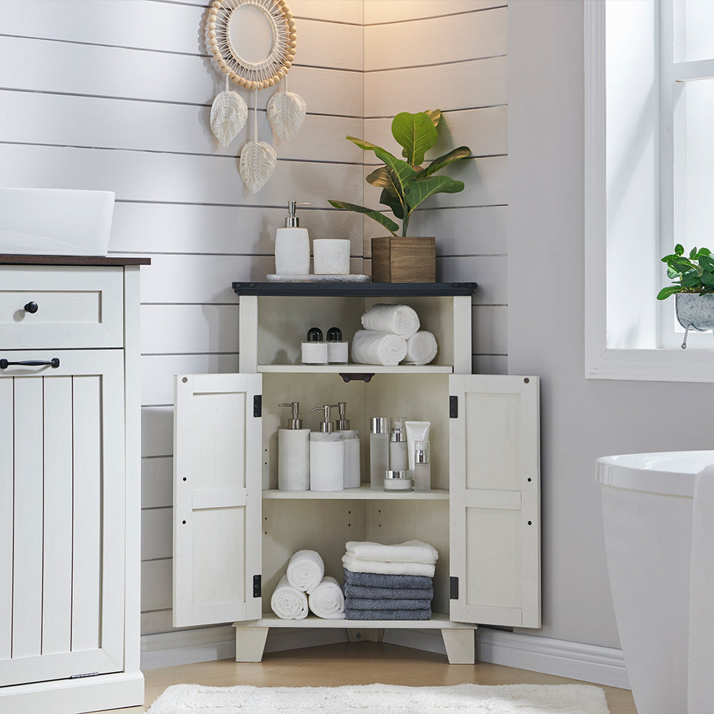 - [Adjustable Shelf]: The adjustable shelf design easily adapts to the size of your belongings, suitable for small and medium items and let your bathroom supplies are no longer a cluttered pile. L-shaped metal bracket have more enhanced support and stability, no need to worry about the shelf tilting. The farmhouse corner cabinet is the embodiment of your sophisticated lifestyle.